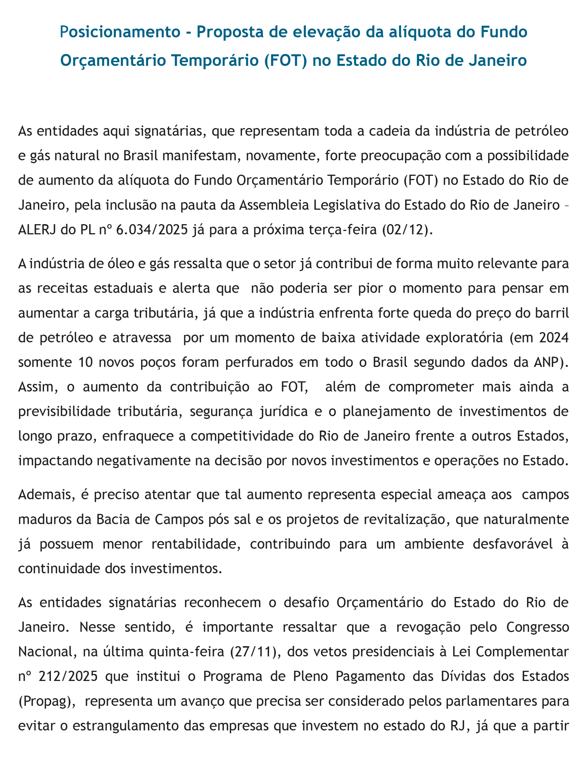 Posicionamento – Proposta de elevação da alíquota do Fundo Orçamentário Temporário (FOT) no Estado do Rio de Janeiro 02 de dez de 2025 Faça o download +